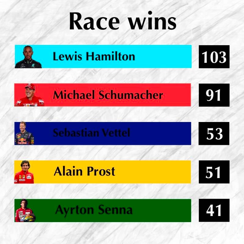 Sir Lewis Hamilton comes out on top again. He has an impressive 103 wins in his career. It continues as his contract with Mercedes Petronas is still active.